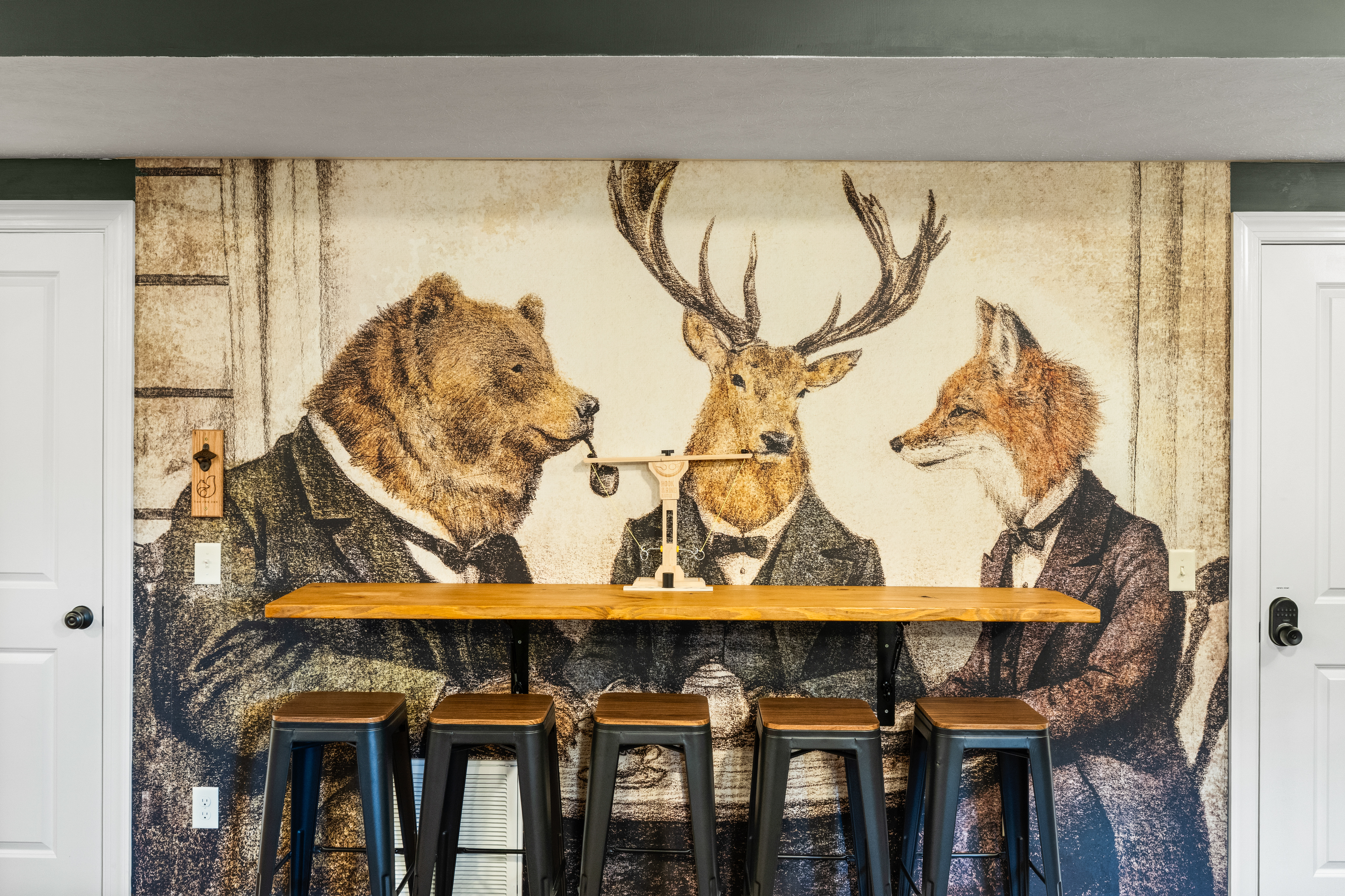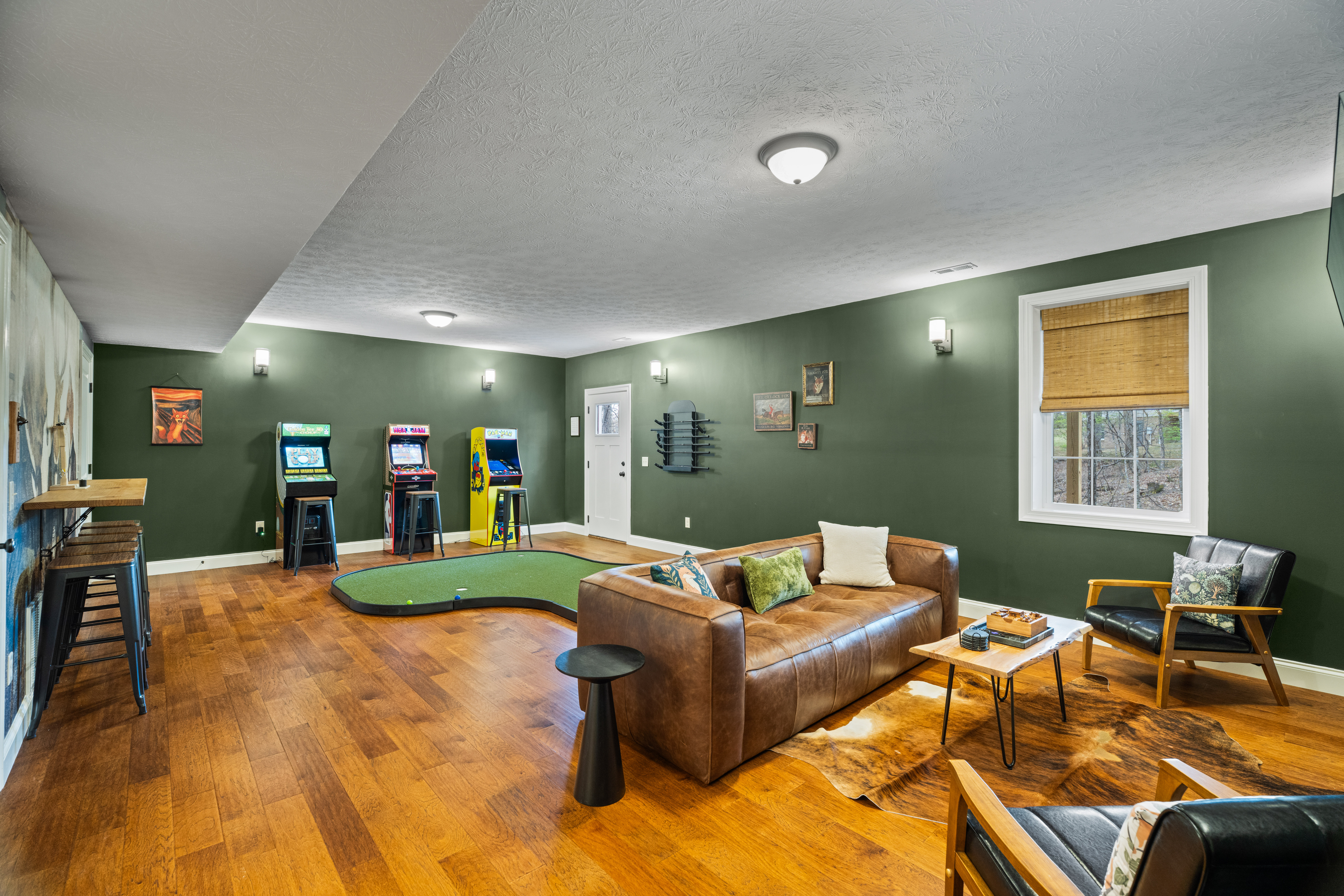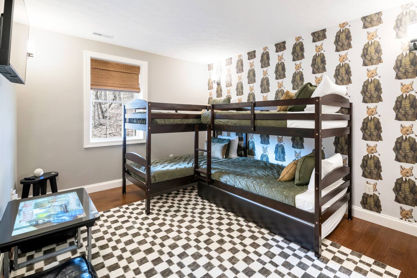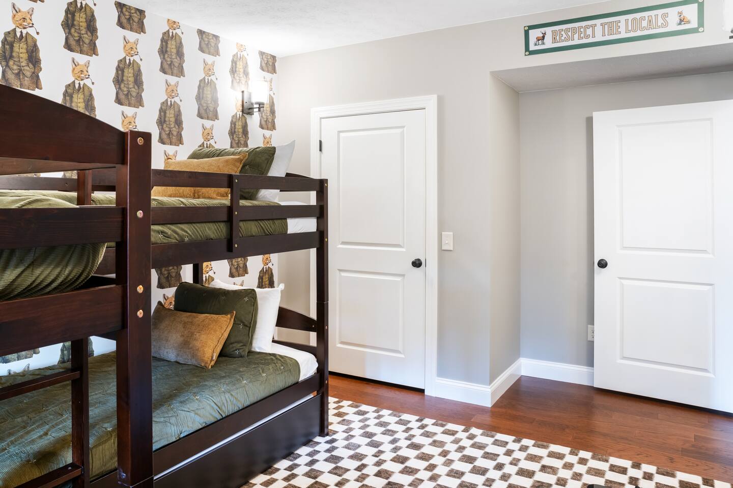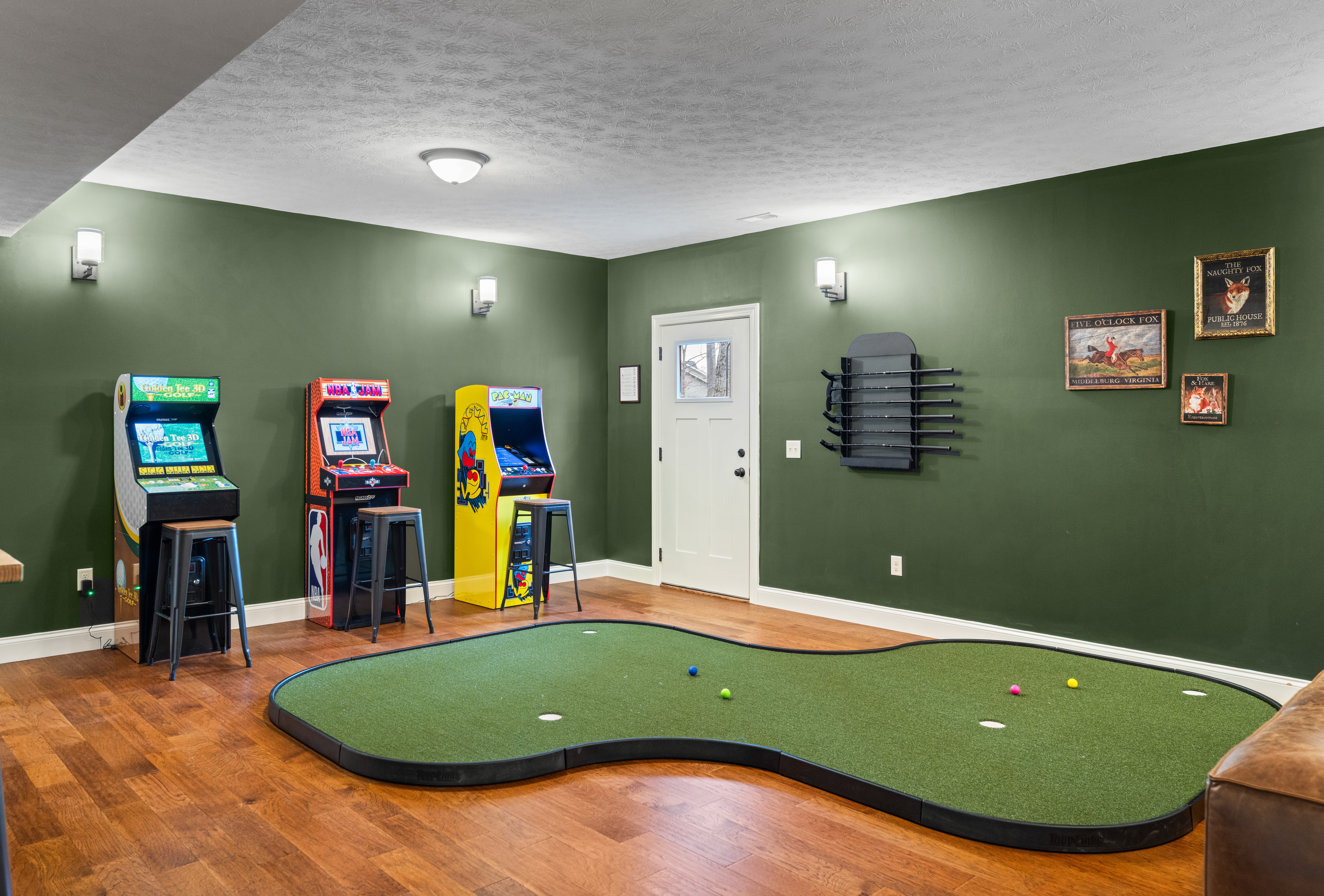 Whether you choose to stay in and enjoy all of the amenities, or explore all that the resort has to offer, The Fox Den has it all! Inside, enjoy 3 levels of well-appointed bedrooms, bathrooms and living spaces, including TWO game rooms, and three en-suites on the top level, each individually curated with a different fox motif. Venture outside to enjoy three separate outdoor areas — a deck with dining, seating and a fire pet, patio with hot tub and ambient lighting, and two seating options on the covered front porch perfect for that morning cup of coffee. With close to 5,000sf of living space, guests can enjoy the following: LIVING ROOM Spacious living area that all flows together from room-to-room, this is truly the heart of the home. Highlights include: ✧ 55” Smart TV with streaming access ✧ Large, oversized sectional for ample seating ✧ Living area room with wraparound sectional for the whole family to cozy up on, an electric fireplace, and bookcases with board games ✧ Entryway with ample coat hooks and shoe storage ✧ Open flow to the kitchen and dining room KITCHEN The fully-equipped kitchen is stocked with every sort of cooking item or entertaining ware you would need for your stay, including two pantries for guest use. Highlights include: ✧ Brand new, stainless steel appliances ✧ Drip and Keurig coffee ✧ Pots, pans and a variety of small appliances and cookware ✧ Indoor and outdoor dining ware as well as kid-friendly ✧ Glasses, glasses and more glasses! Two different sets for indoor and outdoor use ✧ Kitchen island with seating for 4 ✧ Separate dining room with seating for 12 and a buffet with additional entertaining ware for more formal dining occasions PRIMARY BEDROOM Located on the second level, the large primary suite is situated at the rear of the home and includes a luxury ensuite bath — making it your personal retreat and the perfect place to unwind after a day of activities. Highlights include: ✧ King bed with hotel-grade linens ✧ Blackout shades ✧ 50” Smart TV with streaming access ✧ Dresser and closet space ✧ Extra large ensuite with jetted tub/shower combo, separate water closet, his and hers vanity ✧ Full nursery with crib, blackout shades and play area — perfect for the littlest of guests! ADDITIONAL BEDROOM AND BATHROOMS There are 5 additional bedrooms spread out across the three levels. Kids and parents alike can have their own private sanctuaries with bedrooms designed with each in mind on the top and lower levels. Highlights include: ★ Bedroom 1 (main level): Queen bed, blackout shades, dresser, 43” Smart TV, closet ★ Bedroom 2 (second level): King bed, blackout shades, desk and workspace, 43” Smart TV, closet, ensuite bath with shower/tub combo ★ Bedroom 3 (second level): Queen bed, blackout shades, dresser, 43” Smart TV, closet, ensuite bath with shower/tub combo ★ Bedroom 4 (lower level): Two Queen beds, blackout shades, dresser, 43” Smart TV, closet, wall-mounted Connect 4 ★ Bedroom 5 (lower level): L-shaped bunk beds with 4 twin beds + trundle, blackout shades, dresser, 43” Smart TV, infinity game table (with loads of digital board games) GAME ROOMS There are two game rooms for guest enjoyment. The lower level is a true entertainment hub complete with arcade games, putting green and bar area. On the second level, guests can enjoy a board game area with a chess table and a separate reading nook. Highlights of the lower level game room include: ✧ 4 hole putting green ✧ 3 arcade games (Golden Tee, NBA Jam, Pacman) ✧ Bar area ✧ 75” Smart TV and seating area ✧ Bluetooth speaker ✧ Bar games OUTDOOR SPACE There are three outdoor areas for your enjoyment! Whether it’s coffee in the morning, a meal in the evening, or a sunset soak, the outdoor area provides a tranquil escape on the resort. Highlights include: ✧ Hot tub with ambient lighting and towel hooks (fits 7) ✧ Propane fit pit area (seats 8, propane provided) ✧ Dining table (seats 8) ✧ Propane grill (propane provided) ✧ Rocking chairs and glider under a covered front porch LOCATION ✔ 5 minutes to Massanutten Resort (slopes, pool, adventure course) ✔ 6 minutes for golf course(s) ✔ 6 minutes to the Indoor/Outdoor Waterpark ✔ 20 minutes from Swift Run Gap entrance of Shenandoah National Park ✔ 25 minutes to Harrisonburg & JMU ✔ Close to highway access for hiking, wineries, breweries, dining and scenic drives