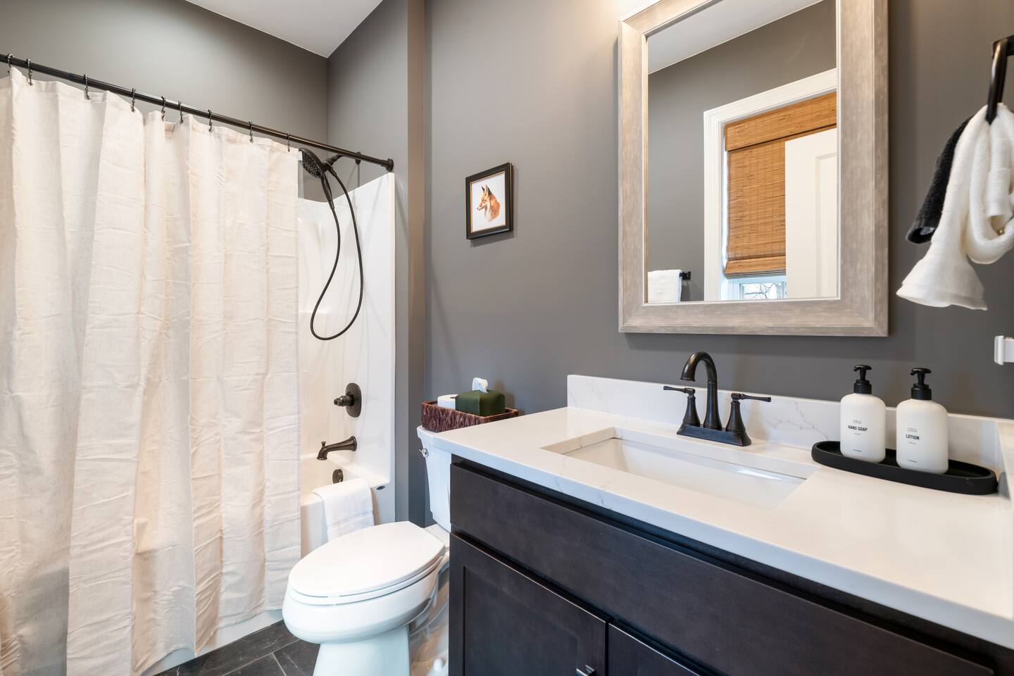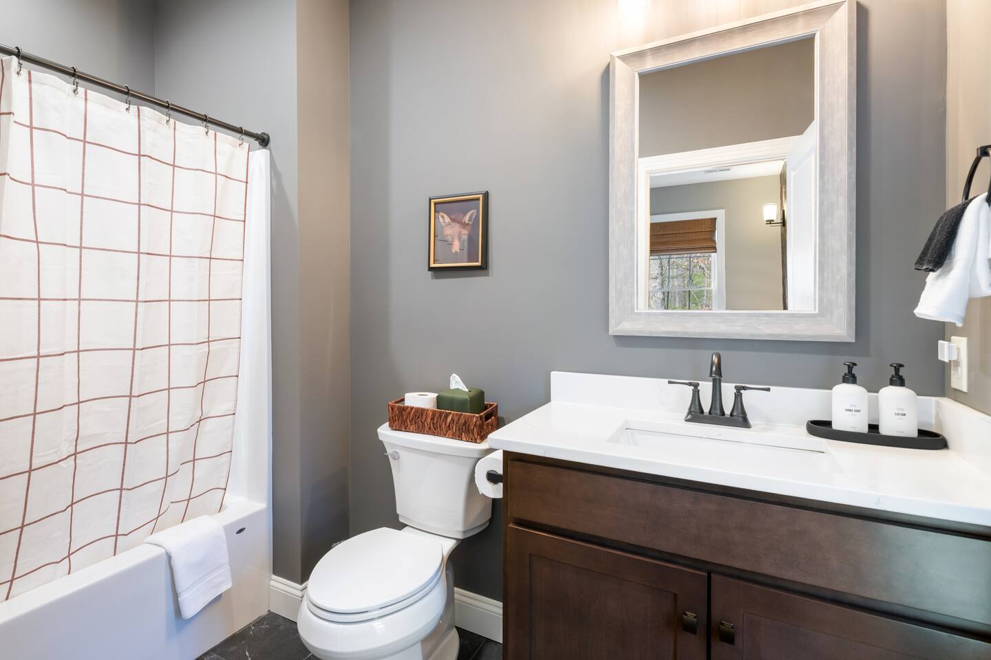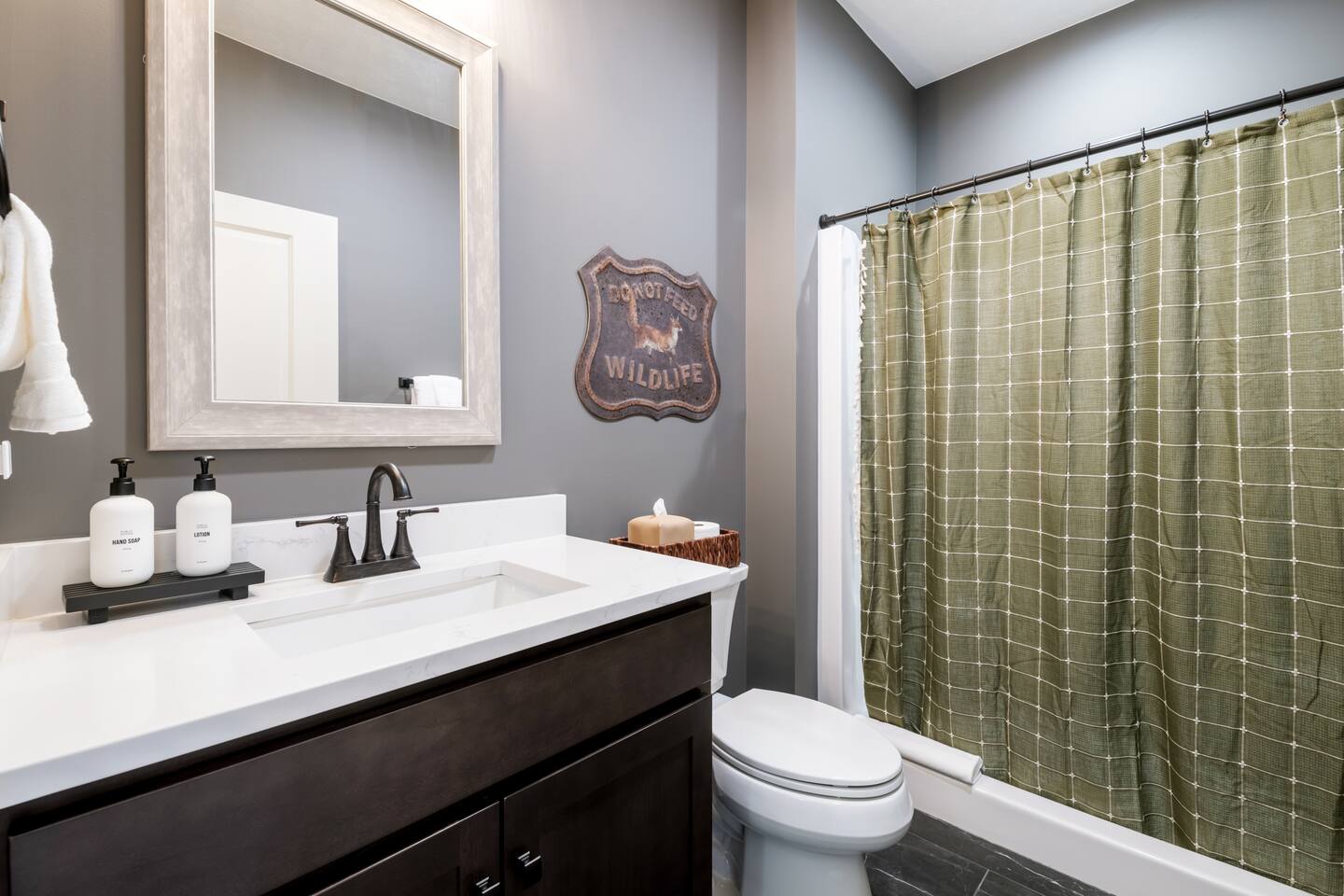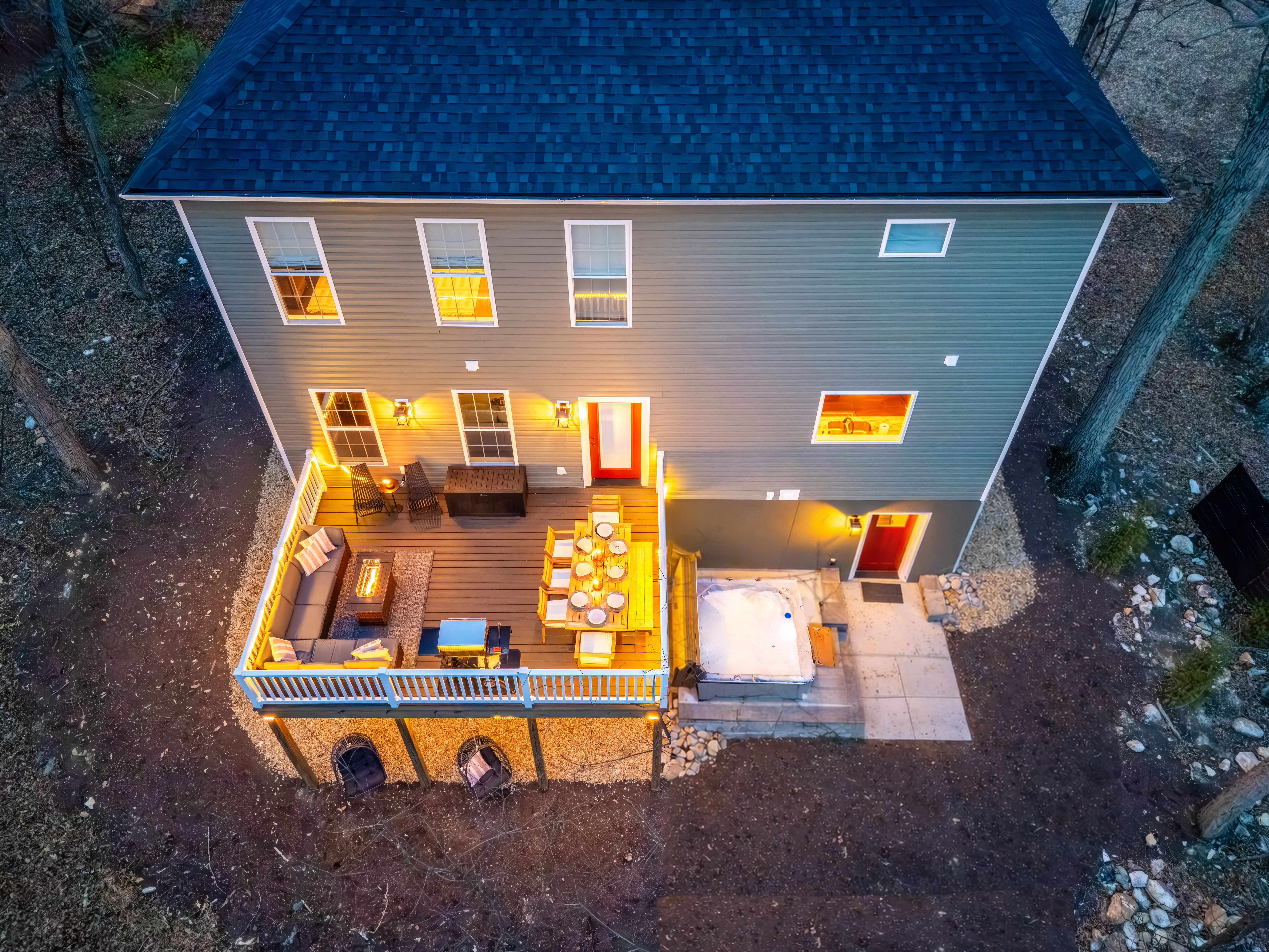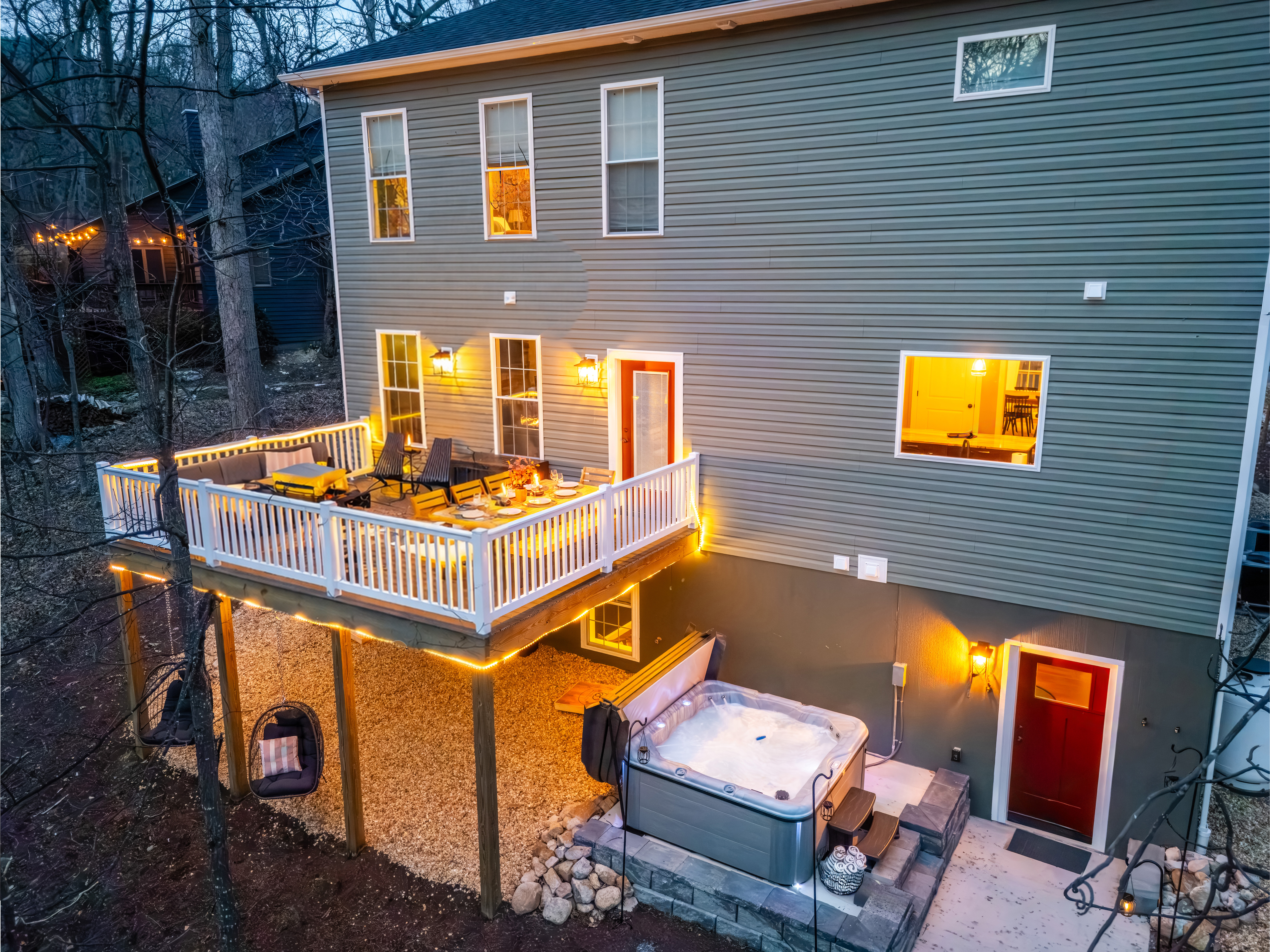 Whether you choose to stay in and enjoy all of the amenities, or explore all that the resort has to offer, The Fox Den has it all! Inside, enjoy 3 levels of well-appointed bedrooms, bathrooms and living spaces, including TWO game rooms, and three en-suites on the top level, each individually curated with a different fox motif. Venture outside to enjoy three separate outdoor areas — a deck with dining, seating and a fire pet, patio with hot tub and ambient lighting, and two seating options on the covered front porch perfect for that morning cup of coffee. With close to 5,000sf of living space, guests can enjoy the following: LIVING ROOM Spacious living area that all flows together from room-to-room, this is truly the heart of the home. Highlights include: ✧ 55” Smart TV with streaming access ✧ Large, oversized sectional for ample seating ✧ Living area room with wraparound sectional for the whole family to cozy up on, an electric fireplace, and bookcases with board games ✧ Entryway with ample coat hooks and shoe storage ✧ Open flow to the kitchen and dining room KITCHEN The fully-equipped kitchen is stocked with every sort of cooking item or entertaining ware you would need for your stay, including two pantries for guest use. Highlights include: ✧ Brand new, stainless steel appliances ✧ Drip and Keurig coffee ✧ Pots, pans and a variety of small appliances and cookware ✧ Indoor and outdoor dining ware as well as kid-friendly ✧ Glasses, glasses and more glasses! Two different sets for indoor and outdoor use ✧ Kitchen island with seating for 4 ✧ Separate dining room with seating for 12 and a buffet with additional entertaining ware for more formal dining occasions PRIMARY BEDROOM Located on the second level, the large primary suite is situated at the rear of the home and includes a luxury ensuite bath — making it your personal retreat and the perfect place to unwind after a day of activities. Highlights include: ✧ King bed with hotel-grade linens ✧ Blackout shades ✧ 50” Smart TV with streaming access ✧ Dresser and closet space ✧ Extra large ensuite with jetted tub/shower combo, separate water closet, his and hers vanity ✧ Full nursery with crib, blackout shades and play area — perfect for the littlest of guests! ADDITIONAL BEDROOM AND BATHROOMS There are 5 additional bedrooms spread out across the three levels. Kids and parents alike can have their own private sanctuaries with bedrooms designed with each in mind on the top and lower levels. Highlights include: ★ Bedroom 1 (main level): Queen bed, blackout shades, dresser, 43” Smart TV, closet ★ Bedroom 2 (second level): King bed, blackout shades, desk and workspace, 43” Smart TV, closet, ensuite bath with shower/tub combo ★ Bedroom 3 (second level): Queen bed, blackout shades, dresser, 43” Smart TV, closet, ensuite bath with shower/tub combo ★ Bedroom 4 (lower level): Two Queen beds, blackout shades, dresser, 43” Smart TV, closet, wall-mounted Connect 4 ★ Bedroom 5 (lower level): L-shaped bunk beds with 4 twin beds + trundle, blackout shades, dresser, 43” Smart TV, infinity game table (with loads of digital board games) GAME ROOMS There are two game rooms for guest enjoyment. The lower level is a true entertainment hub complete with arcade games, putting green and bar area. On the second level, guests can enjoy a board game area with a chess table and a separate reading nook. Highlights of the lower level game room include: ✧ 4 hole putting green ✧ 3 arcade games (Golden Tee, NBA Jam, Pacman) ✧ Bar area ✧ 75” Smart TV and seating area ✧ Bluetooth speaker ✧ Bar games OUTDOOR SPACE There are three outdoor areas for your enjoyment! Whether it’s coffee in the morning, a meal in the evening, or a sunset soak, the outdoor area provides a tranquil escape on the resort. Highlights include: ✧ Hot tub with ambient lighting and towel hooks (fits 7) ✧ Propane fit pit area (seats 8, propane provided) ✧ Dining table (seats 8) ✧ Propane grill (propane provided) ✧ Rocking chairs and glider under a covered front porch LOCATION ✔ 5 minutes to Massanutten Resort (slopes, pool, adventure course) ✔ 6 minutes for golf course(s) ✔ 6 minutes to the Indoor/Outdoor Waterpark ✔ 20 minutes from Swift Run Gap entrance of Shenandoah National Park ✔ 25 minutes to Harrisonburg & JMU ✔ Close to highway access for hiking, wineries, breweries, dining and scenic drives