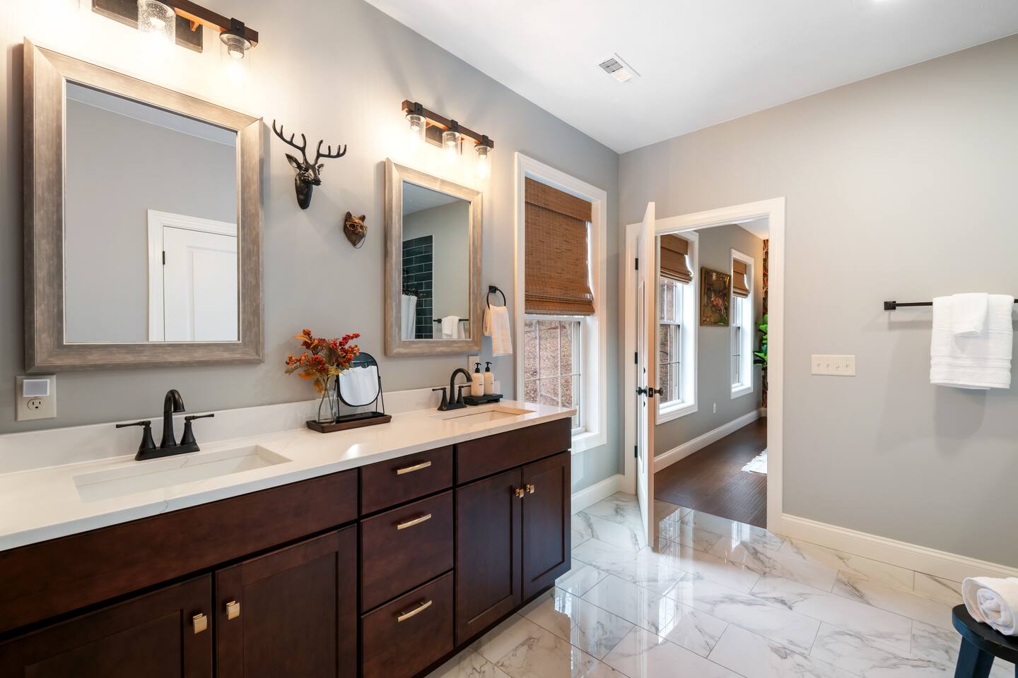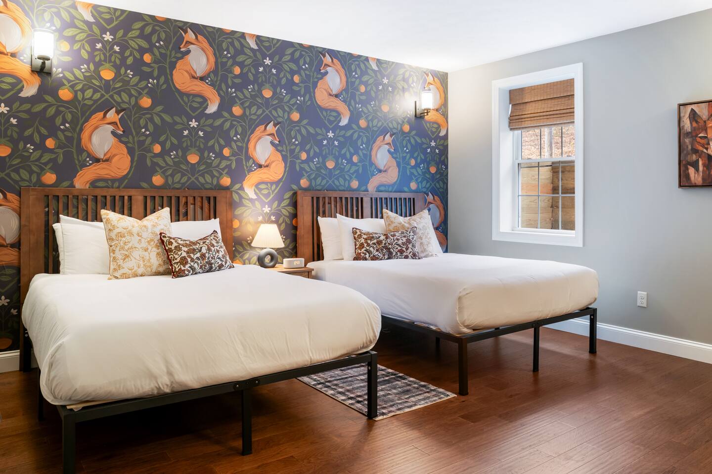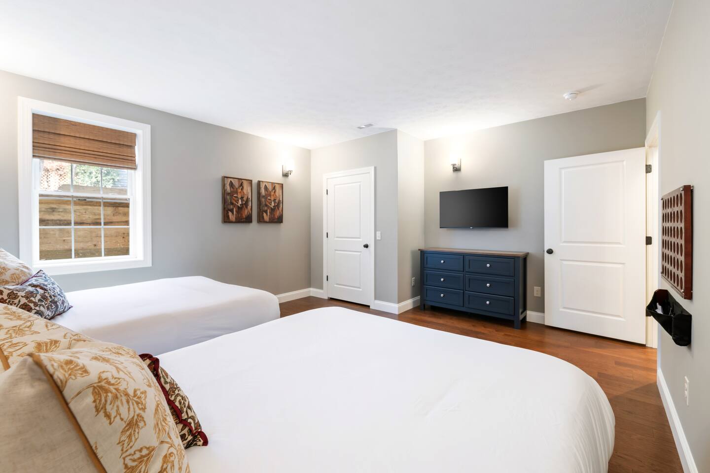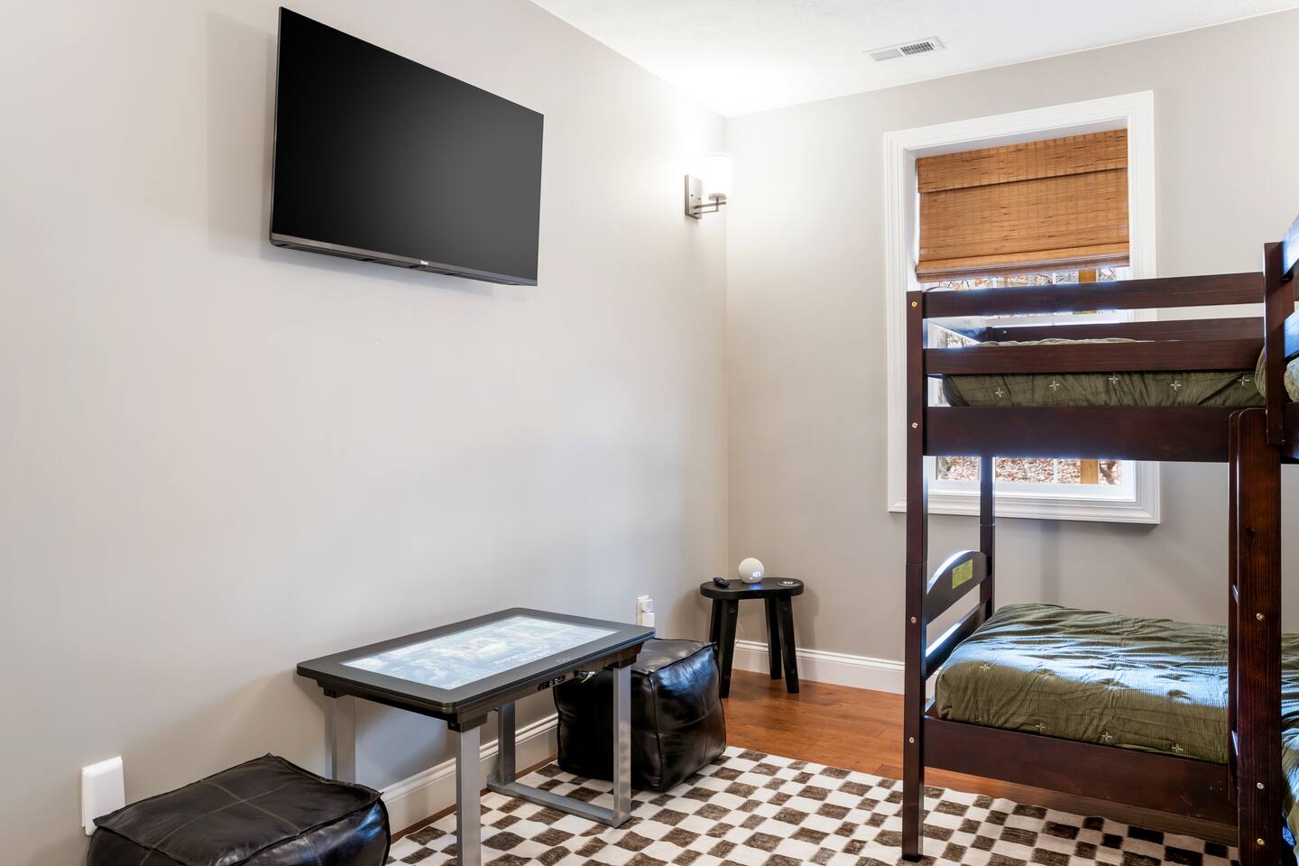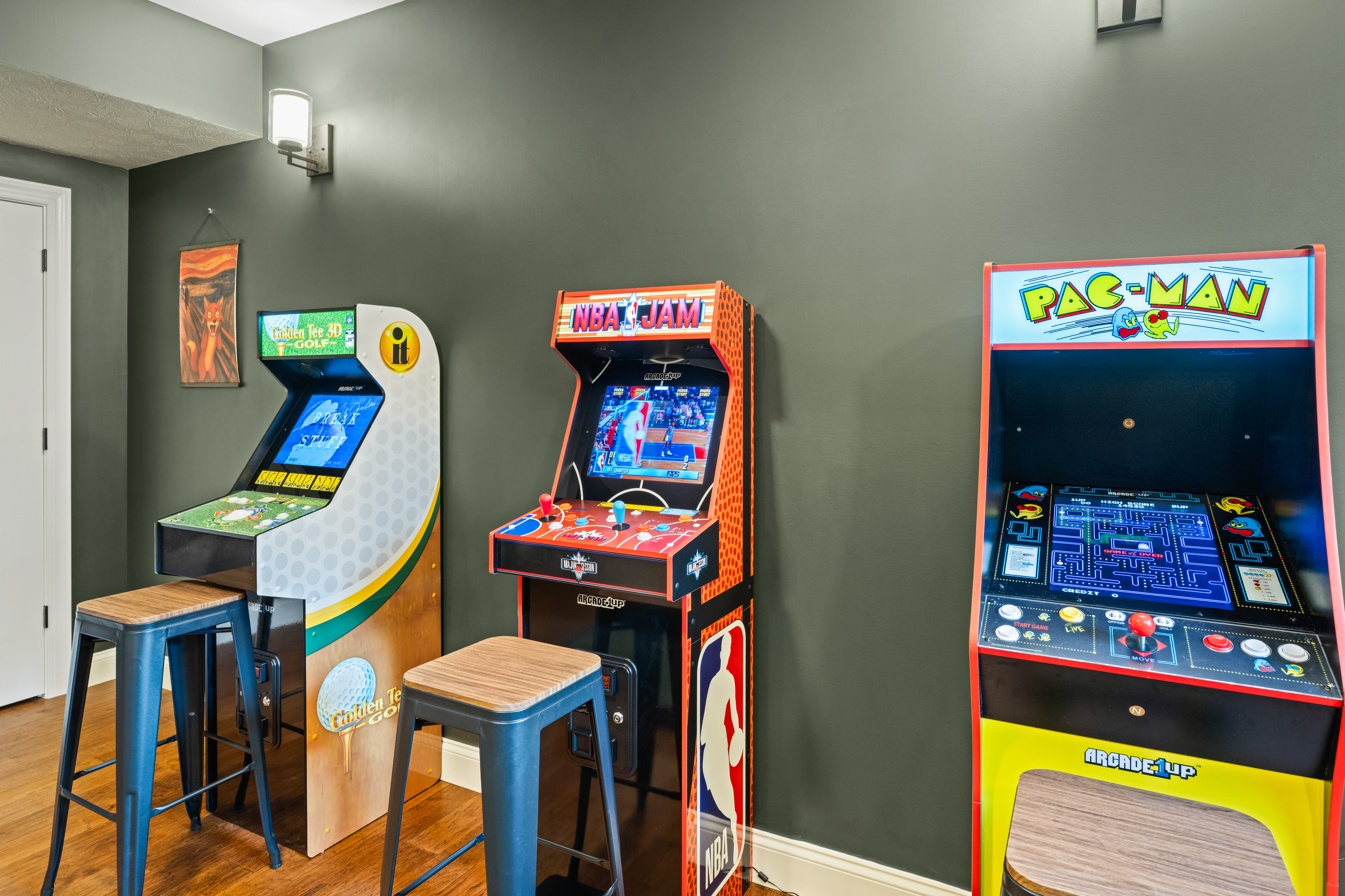 Whether you choose to stay in and enjoy all of the amenities, or explore all that the resort has to offer, The Fox Den has it all! Inside, enjoy 3 levels of well-appointed bedrooms, bathrooms and living spaces, including TWO game rooms, and three en-suites on the top level, each individually curated with a different fox motif. Venture outside to enjoy three separate outdoor areas — a deck with dining, seating and a fire pet, patio with hot tub and ambient lighting, and two seating options on the covered front porch perfect for that morning cup of coffee. With close to 5,000sf of living space, guests can enjoy the following: LIVING ROOM Spacious living area that all flows together from room-to-room, this is truly the heart of the home. Highlights include: ✧ 55” Smart TV with streaming access ✧ Large, oversized sectional for ample seating ✧ Living area room with wraparound sectional for the whole family to cozy up on, an electric fireplace, and bookcases with board games ✧ Entryway with ample coat hooks and shoe storage ✧ Open flow to the kitchen and dining room KITCHEN The fully-equipped kitchen is stocked with every sort of cooking item or entertaining ware you would need for your stay, including two pantries for guest use. Highlights include: ✧ Brand new, stainless steel appliances ✧ Drip and Keurig coffee ✧ Pots, pans and a variety of small appliances and cookware ✧ Indoor and outdoor dining ware as well as kid-friendly ✧ Glasses, glasses and more glasses! Two different sets for indoor and outdoor use ✧ Kitchen island with seating for 4 ✧ Separate dining room with seating for 12 and a buffet with additional entertaining ware for more formal dining occasions PRIMARY BEDROOM Located on the second level, the large primary suite is situated at the rear of the home and includes a luxury ensuite bath — making it your personal retreat and the perfect place to unwind after a day of activities. Highlights include: ✧ King bed with hotel-grade linens ✧ Blackout shades ✧ 50” Smart TV with streaming access ✧ Dresser and closet space ✧ Extra large ensuite with jetted tub/shower combo, separate water closet, his and hers vanity ✧ Full nursery with crib, blackout shades and play area — perfect for the littlest of guests! ADDITIONAL BEDROOM AND BATHROOMS There are 5 additional bedrooms spread out across the three levels. Kids and parents alike can have their own private sanctuaries with bedrooms designed with each in mind on the top and lower levels. Highlights include: ★ Bedroom 1 (main level): Queen bed, blackout shades, dresser, 43” Smart TV, closet ★ Bedroom 2 (second level): King bed, blackout shades, desk and workspace, 43” Smart TV, closet, ensuite bath with shower/tub combo ★ Bedroom 3 (second level): Queen bed, blackout shades, dresser, 43” Smart TV, closet, ensuite bath with shower/tub combo ★ Bedroom 4 (lower level): Two Queen beds, blackout shades, dresser, 43” Smart TV, closet, wall-mounted Connect 4 ★ Bedroom 5 (lower level): L-shaped bunk beds with 4 twin beds + trundle, blackout shades, dresser, 43” Smart TV, infinity game table (with loads of digital board games) GAME ROOMS There are two game rooms for guest enjoyment. The lower level is a true entertainment hub complete with arcade games, putting green and bar area. On the second level, guests can enjoy a board game area with a chess table and a separate reading nook. Highlights of the lower level game room include: ✧ 4 hole putting green ✧ 3 arcade games (Golden Tee, NBA Jam, Pacman) ✧ Bar area ✧ 75” Smart TV and seating area ✧ Bluetooth speaker ✧ Bar games OUTDOOR SPACE There are three outdoor areas for your enjoyment! Whether it’s coffee in the morning, a meal in the evening, or a sunset soak, the outdoor area provides a tranquil escape on the resort. Highlights include: ✧ Hot tub with ambient lighting and towel hooks (fits 7) ✧ Propane fit pit area (seats 8, propane provided) ✧ Dining table (seats 8) ✧ Propane grill (propane provided) ✧ Rocking chairs and glider under a covered front porch LOCATION ✔ 5 minutes to Massanutten Resort (slopes, pool, adventure course) ✔ 6 minutes for golf course(s) ✔ 6 minutes to the Indoor/Outdoor Waterpark ✔ 20 minutes from Swift Run Gap entrance of Shenandoah National Park ✔ 25 minutes to Harrisonburg & JMU ✔ Close to highway access for hiking, wineries, breweries, dining and scenic drives